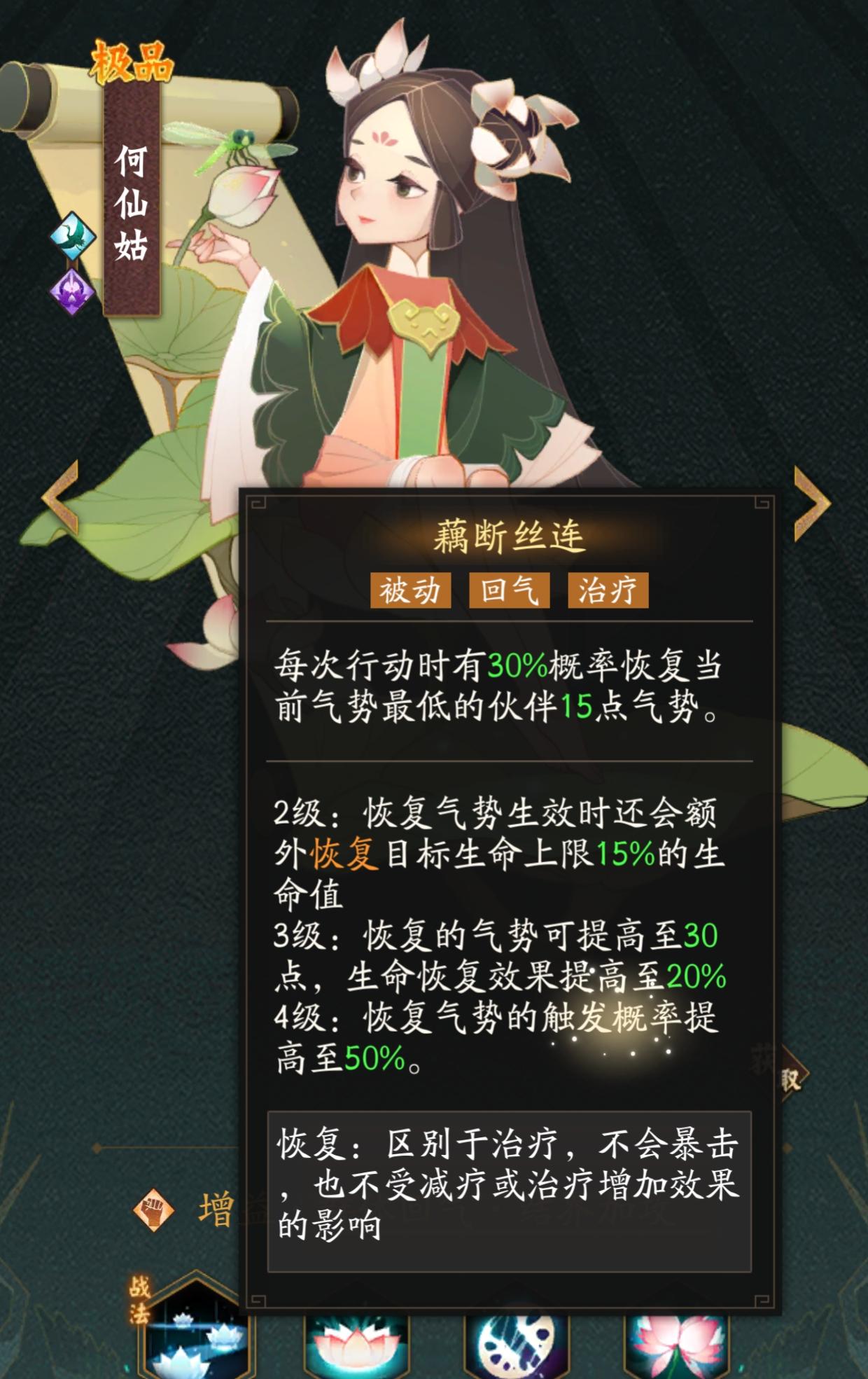 ,技能减少气势,何仙姑只要释放战法直接将敌方满额气势清零。不仅西门小吹、战法也具有降低敌方气势的效果。而且要了解气势是100时,当轮到该伙伴出手其可以释放战法技能,当气势超过100后,气势越多战法造成的伤害越高,释放后气势通常变为0。
