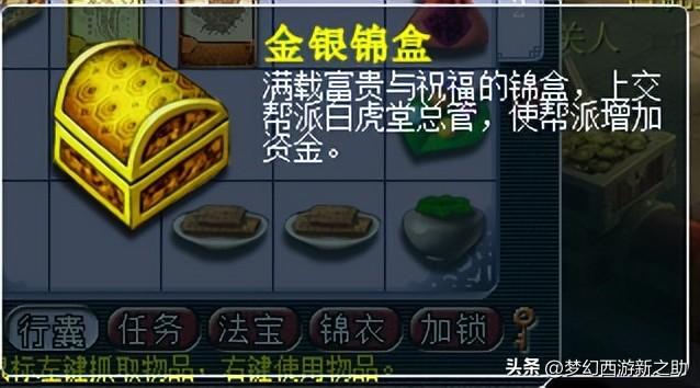 金银锦盒。每个盒子5点帮贡,一定要选有补助的帮派再丢盒子,基本补助1w一个盒子,直接收可以是2.2-2.5W一个,换算下来大约1.5w梦幻币换5点帮贡。