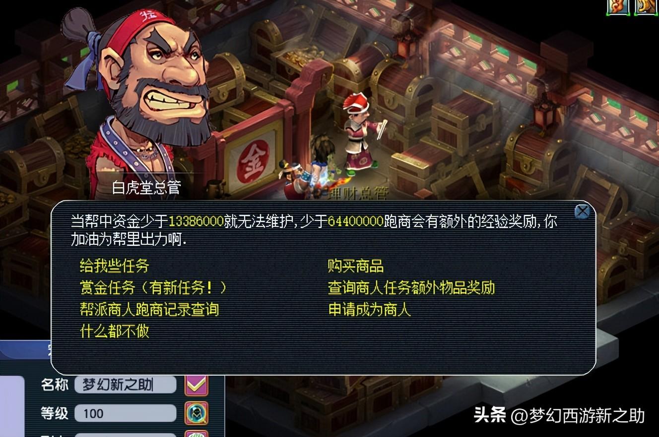 白虎堂任务。也就是俗称的跑商,在帮派金库可以领取可以获得经验,游戏币以及帮贡的奖励,不少帮派还会有跑商的奖励。如果手中的W富裕可以发布赏金任务。