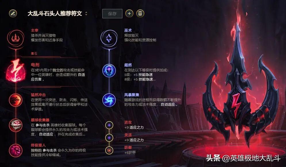 符文解析:电刑是比较通用的方案,保证大过去能一套秒脆皮。毕竟石头人作为近战法师,想通过Q技能叠高层数黑暗收割非常不现实。