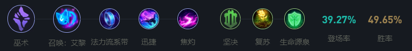 艾黎为星妈提供更佳的血量效果,法力流系带来弥补星妈前期蓝量不够的问题,迅捷配合上星妈的被动提升星妈的机动性,在团战中可以快速移动为各位英雄提供血量恢复,焦灼提升星妈的消耗能力。复苏可以使星妈的技能治疗效果更高,生命源泉使星妈在攻击移动受损的英雄时获得血量恢复效果。