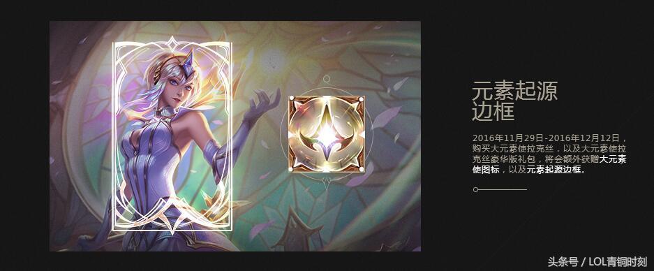 11.29日英雄联盟出了一款最炫酷的皮肤,大元素使拉克丝并且这个大元素使 拉克丝 19900点券礼包而且附带了光明火焰水流气旋自然物种召唤师头像,而另外一种则是豪华大礼包要需要25500点券这个完全则是”土豪大礼包“要比之前的多出大元素使守卫和另外的五种召唤师头像分别是:岩浆图标,风暴图标,秘书图标,冰霜图标 黑暗图标五种,简直是”豪无人性“啊!同时,这个价格在皮肤上也创出了腾讯英雄联盟皮肤只要199的最高记录!
