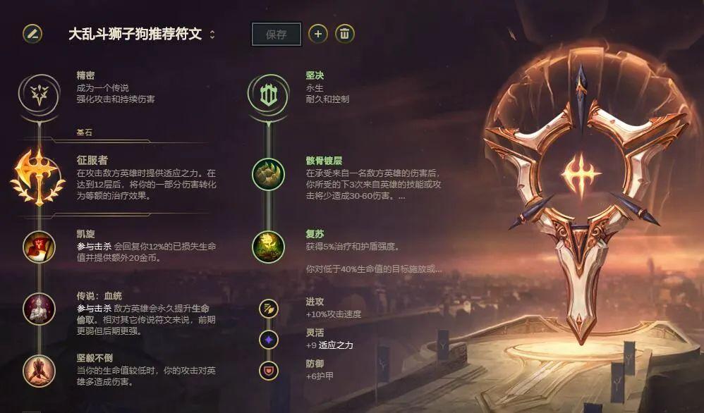 符文解析:狮子狗技能机制叠征服者很快,自适应之力利于战士型狮子狗打法,叠满后的回血效果也很受用。