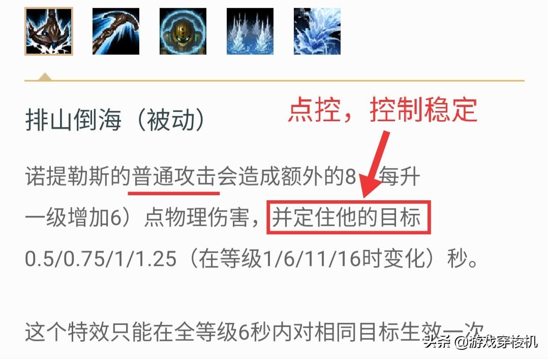 缺点:因为被动是靠平A触发的,而诺提勒斯的平A速度是慢得感人,起手动作太大,玩不习惯的人可能只看到诺提勒斯在一直举起大铁锚,而不见控制到敌人,特别是在团战紧张的环境下,所以这个手感需要练习,另一个就是对同一个敌人控制间隔是6秒,这个时间段要靠自己时刻注意敌人身上的圈来触发,注意力有一定的要求。