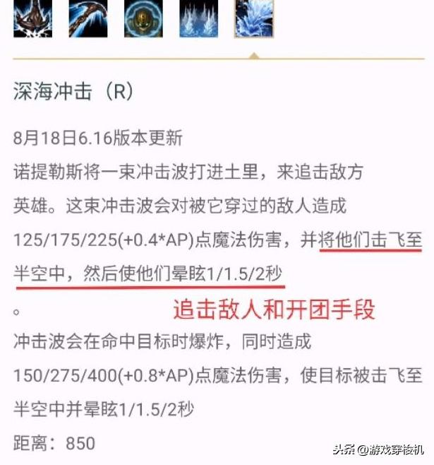 诺提勒斯的终极技能,是一个不错的开团技能,指定技能一般不会空大,而且在追击指定敌人时能同时击飞站在冲击波上的敌人,所以可以说是点控或群控,但要注意的是: