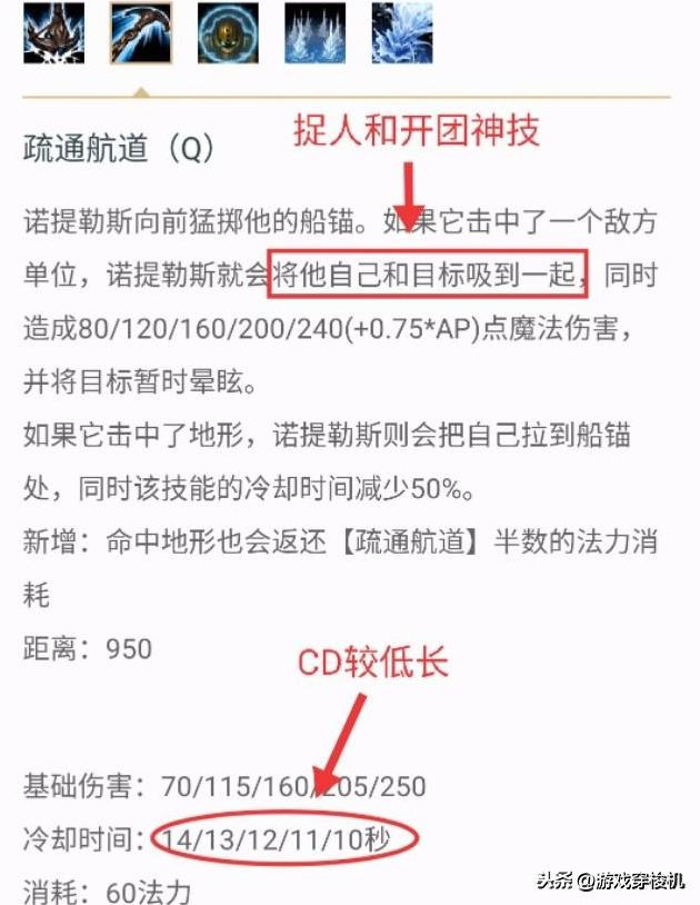 充当位移。诺提勒斯本身是一个没有位移的英雄,但是Q技能的效果是击中地形,诺提勒斯将把自己拉到船锚处,同时还会减少技能50%的冷却时间,这样让诺提勒斯又多出了一个位移技能,在上线时可以利用地形来加快上线,还有就是加大容错率,如果敌人是在靠墙的,诺提勒斯这时就不需要一定要钩中敌人了,只要钩中敌人旁边的墙就可以位移到适合的地方,进行对敌人的控制。