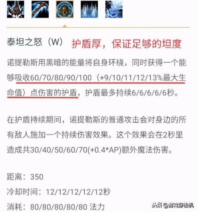 W技能主要是为诺提勒斯提供坦度,在玩辅助一般会主W,因为随着级数的增加,厚度会越来越大,在有一个良好的坦度,才能打出更多的控制;其次就是要利用这个盾在线上打消耗,诸如抵消敌方的技能伤害和防御塔的伤害;最后就是一定要记住不要认为W可以打出伤害,这个伤害是很低的,而且距离也很短,如果冒然想用W上去消耗,肯定会吃亏的。