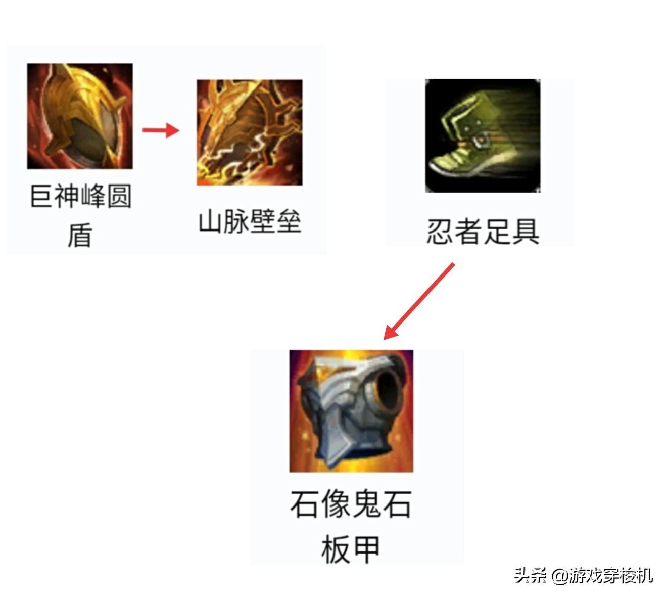 出门装选巨神峰圆盾、两血瓶和监视图腾,因为诺提勒斯大多都是法术伤害,巨神峰圆盾到后面升级到山脉壁垒可以提供少量法术强度。鞋可以合成护甲鞋,抵挡ADC的伤害。石像鬼石板甲是诺提勒斯的核心装备,前中期合出来能提供很可观的坦度,一些小规模团战无脑顶在前面就行,敌方会感到很难受的,有控制,又秒不掉。