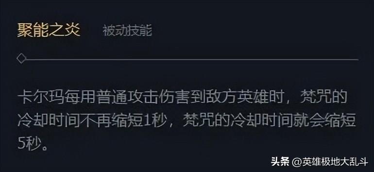 现版本卡尔玛普攻不再减少R技能CD,改成技能每命中一个敌方英雄减5秒CD,想一波团打出两次甚至是三次RE,相当考验Q技能命中率。