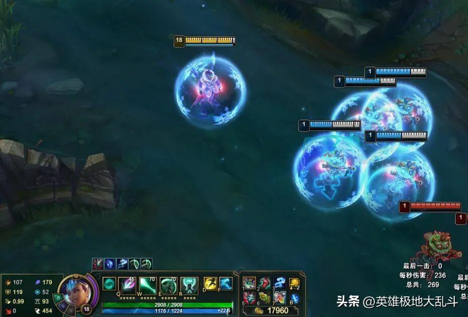 Q技能是AOE伤害,Q中英雄越多减CD越多。