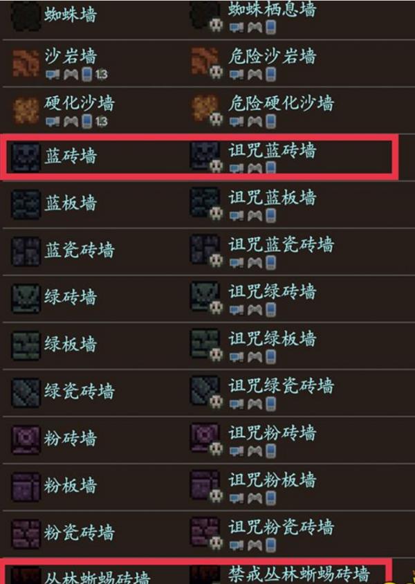泰拉瑞亚1.4.4版本人造地牢利用微光湖将蓝砖墙和丛林蜥蜴墙两种安全墙,转化为诅咒蓝砖墙和禁戒丛林蜥蜴砖墙两种危险墙。
