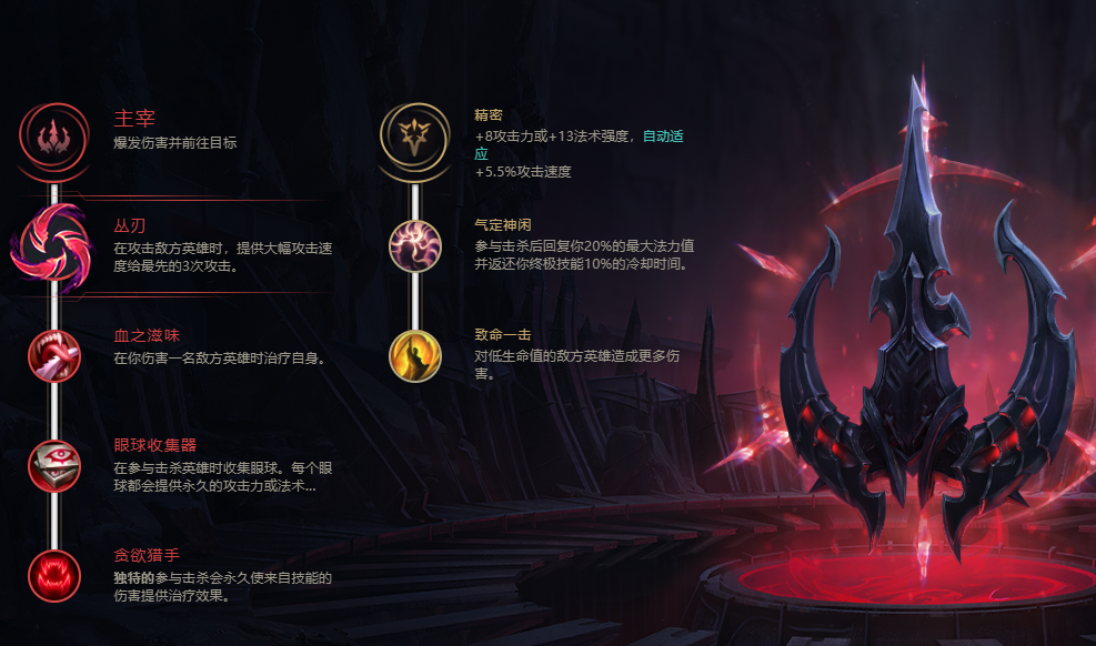 首先在符文方面,主系选择丛刃,目的就是为了在对拼起来的时候,能够快速地三下普攻,配合W技能几乎是瞬间就叠满被动,为接下来E技能的伤害做准备,血之滋味、贪欲猎手,则是保证了老鼠的续航能力。