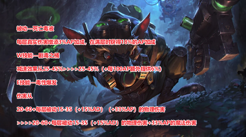 首先我们看一下这个赛季的老鼠的改动,首先被动技能的真实伤害提高了不少,其次就是W技能的减速效果增强,还会随着法术强度提高,是个不错的控制技能。