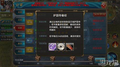 玩家点击主界面右上角的“日常”,页面弹出后点击“国家”,页面下拉,很容易就找到护国寺偷经任务。如果不在任务规定时间内,任务右侧会显示“时间未到”;如果在规定时间内,则可以点击“立即参加”进行挑战。之后玩家会自动寻路,先是在国家边境传送官处被传送到敌国,然后从阳平关进入敌国护国寺。玩家在护国寺内经过重重阻隔奋勇杀敌后便可进行偷经任务,如果经书品质不高不满意还可以换,只是在护国寺待的越久越危险。玩家偷到合适的经书便可以返回本国护国寺交差了。