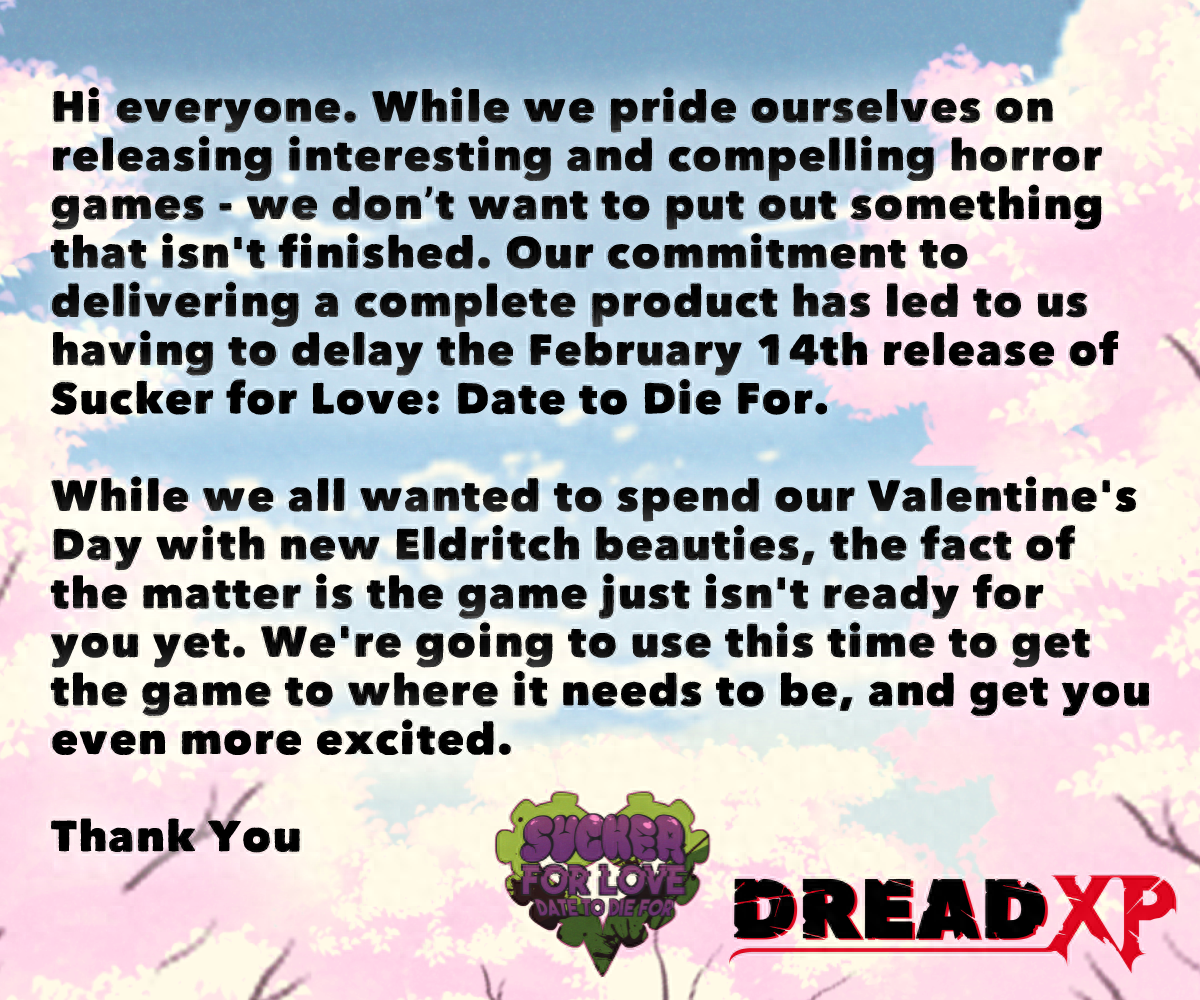 克苏鲁风恋爱模拟游戏《爱的吸盘:死亡约会》宣布将延期发售,该作原计划于2月14日登陆Steam,现在推迟到发售日期待定,延期原因是官方不想推出一款半成品游戏,该作还需要更多时间来开发。