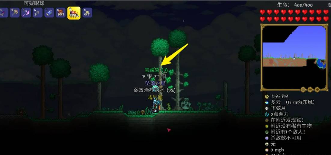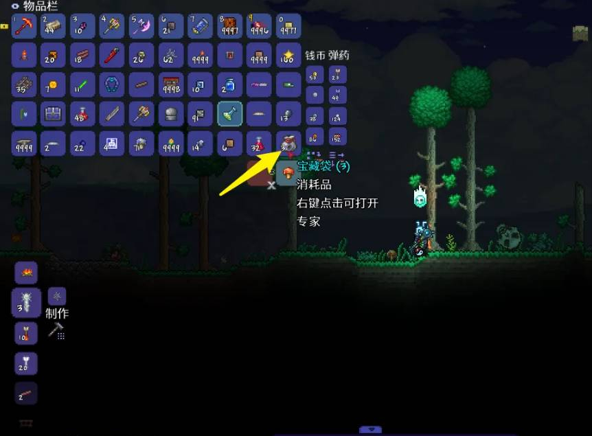 4、专家模式下,克鲁苏之眼死亡掉落宝藏袋,捡起放入背包。