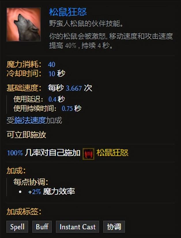 《最后纪元(Last Epoch)》有许多实用性很强的的装备技能和附属小技能,松鼠狂怒就是其中一种技能,而这个松鼠狂怒技能的特点就是你的松鼠会被激怒,移动速度和攻击速度提高40%,持续4秒。
