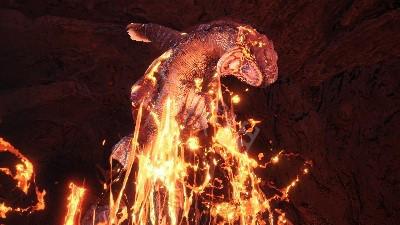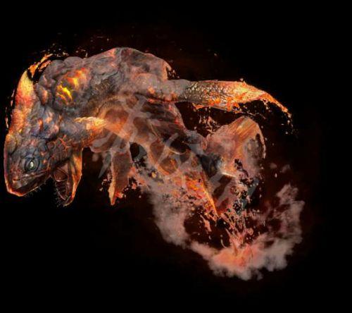 将岩浆池作为主要栖息环境的大型鱼龙种,虽然体型与水龙相近,但其实两者的血缘关系己相当淡薄。熔岩龙的主要食物是迁移过程中经过火山地带的甲壳食草龙和野猪等动物。由于下颚不具备杀伤猎物的功能,它只能采用口含岩浆喷向目标的方法,将猎物烧伤烫死,然后再撕碎囫囵吞下。熔岩龙能抵抗岩浆高温高压的最大原因,在于那覆盖全身、久经岁月凝固而成的熔岩壳,这点和霸龙极其相似。由于长期在高压环境下生活的关系,熔岩龙的胸鳍已经渐渐萎缩,取而代之的是异常发达有力的双脚和尾巴。当它想跨越一些障碍物时,绝大部分力量都来自腿和尾巴的反弹。当看到熔岩龙弹跳起来时,请尽量和它保持距离,因为它的身体太过沉重无法在空中滑翔,所以马上就会砸下来。另外,适应了超高温的熔岩龙也保持着较高的体温,以至于它处于低于五十摄氏度的环境中就可能被冻死。好在它有强健的身体,就算因为捕食搁浅了,也可以尽快蛇行回到岩浆池中。