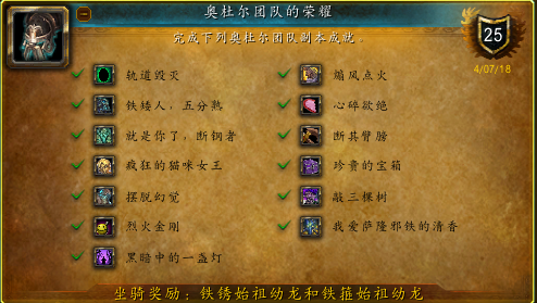 现在奥杜尔副本自从在7.0版本时,因巫妖王版本时光周的加入,曾经的25人模式,改成了只剩10人的普通模式,所以很多25人成就也就绝版了。