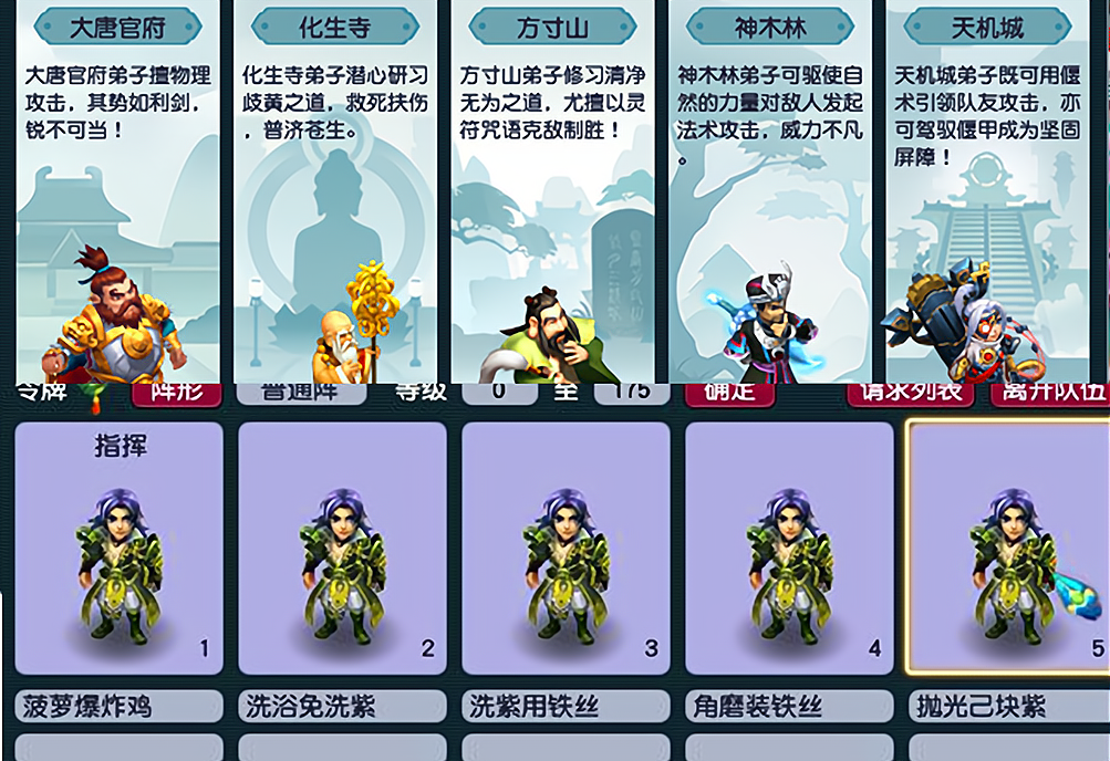 其实最简单的五开就是一个化生寺带四个大唐官府,但是这样的五开比较没有意思,真正有意思的五开是玩五个天机城,进入战斗的时候五个角色一起进入偃甲状态,想想都感觉特别的帅。
